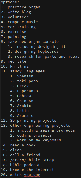 I took a page out of Richard Foster's book and started brainstorming ahead of time what it might look like for me to practice discipline, especially during my free time! If I don't get refreshed during my free time, I might as well not have any.