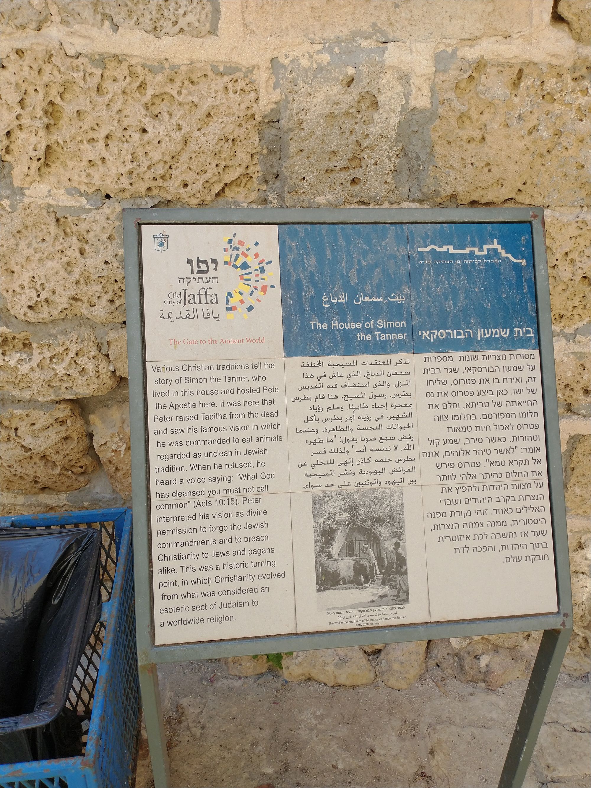 Jaffa, on the other hand, is about 3,800 years old. It appears in the Bible 14 times (under the older name of 'Joppa'). First, in the book of Joshua in reference to the tribal land of Dan. Next, in 2 Chronicles and Ezra as the port where the wood to make the temple was delivered from Lebanon. Jaffa is the place where Jonah got on a boat to run away from Nineveh. Jaffa is where Peter resurrected Tabitha and where Peter saw the vision of a sheet coming down from heaven covered in food. It's fun to note that people still live in the house where Peter had that vision.