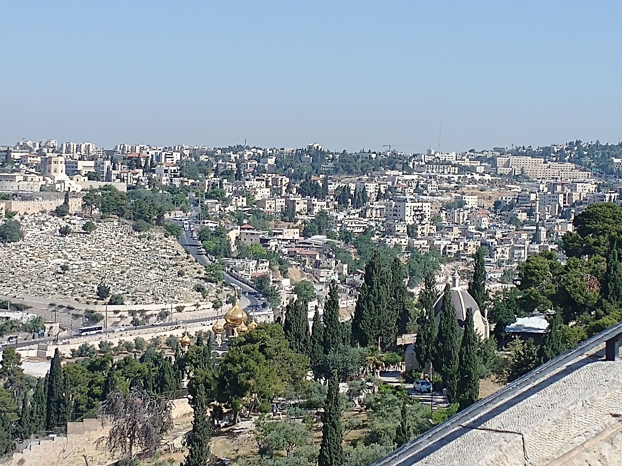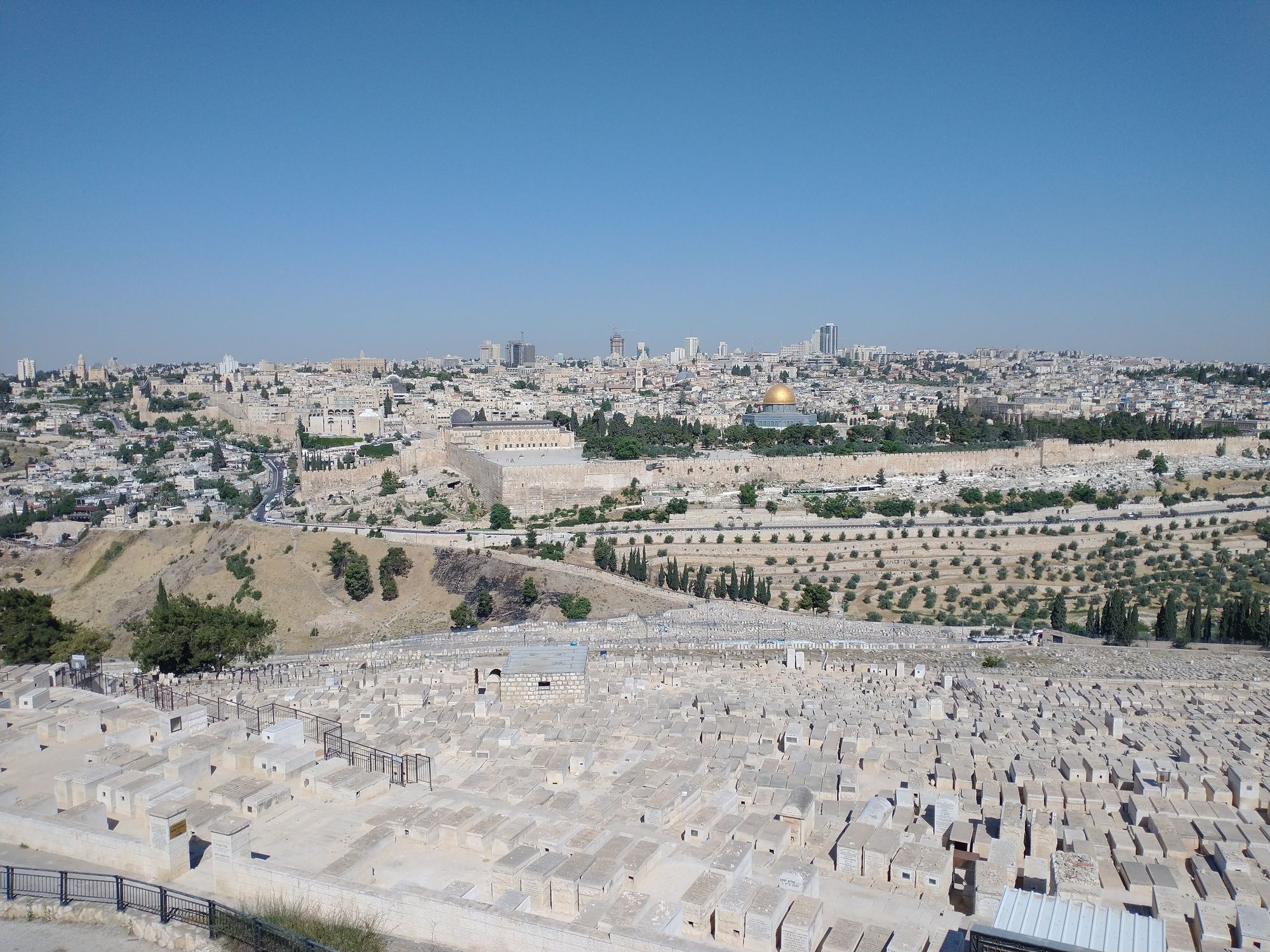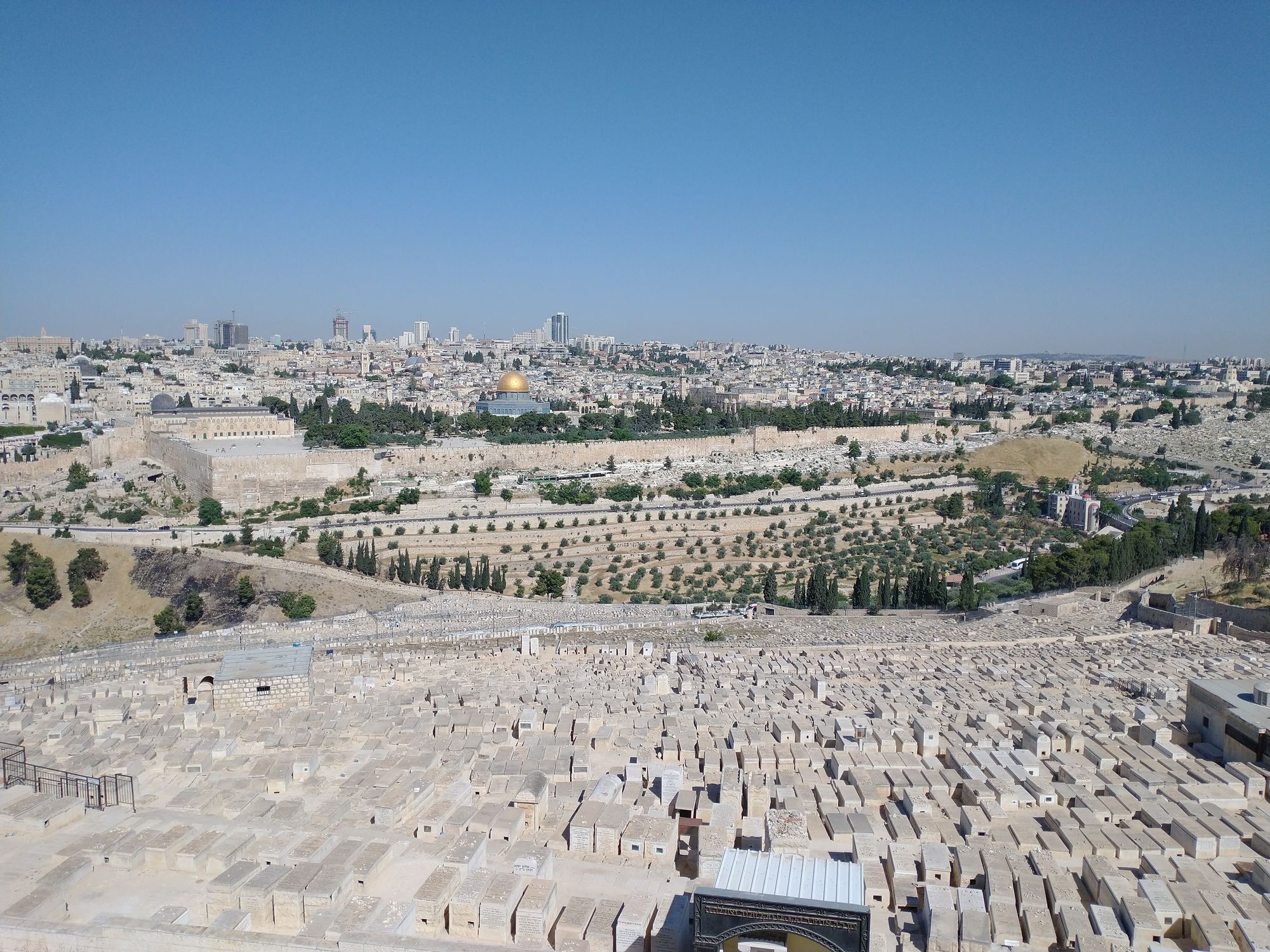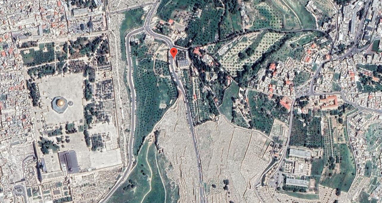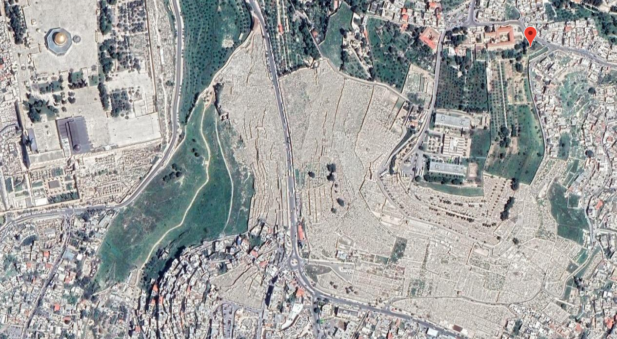 You can see the Golden Dome (on the Temple Mount) in the top left of the map. There's a small valley of green as you move east (part of the Kidron Valley). You can see some buildings and houses around the edges of the map, but the rest of the gray stone area is the cemetery. It's astoundingly large.