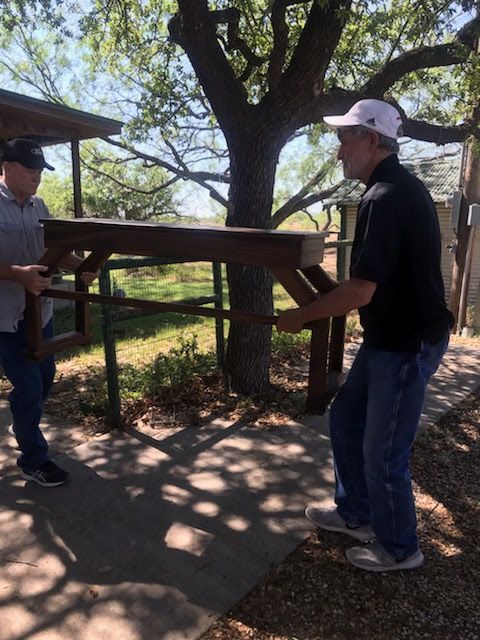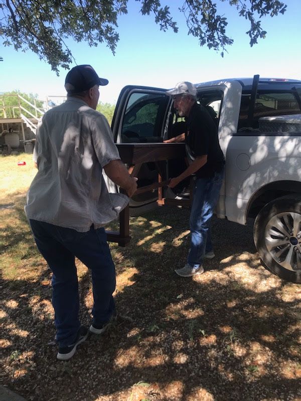 I'm very glad that bench collapsed. To replace it, my spectacular cousin-in-law (who's a master carpenter) built me the best organ bench I've ever seen or heard about. Here's him and my dad moving it in: