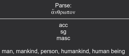 When you try to translate Greek nouns into English, you have to translate the part of speech, the number, and the gender. This is called parsing. The only prompt I need to tell me what to do is the command "Parse."