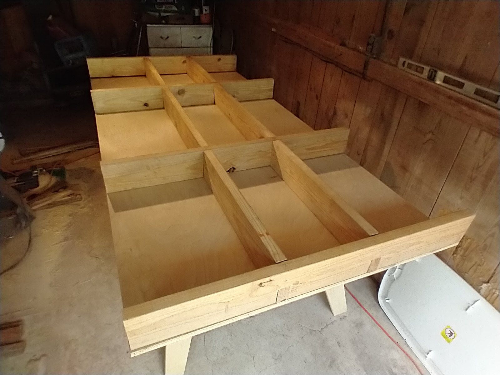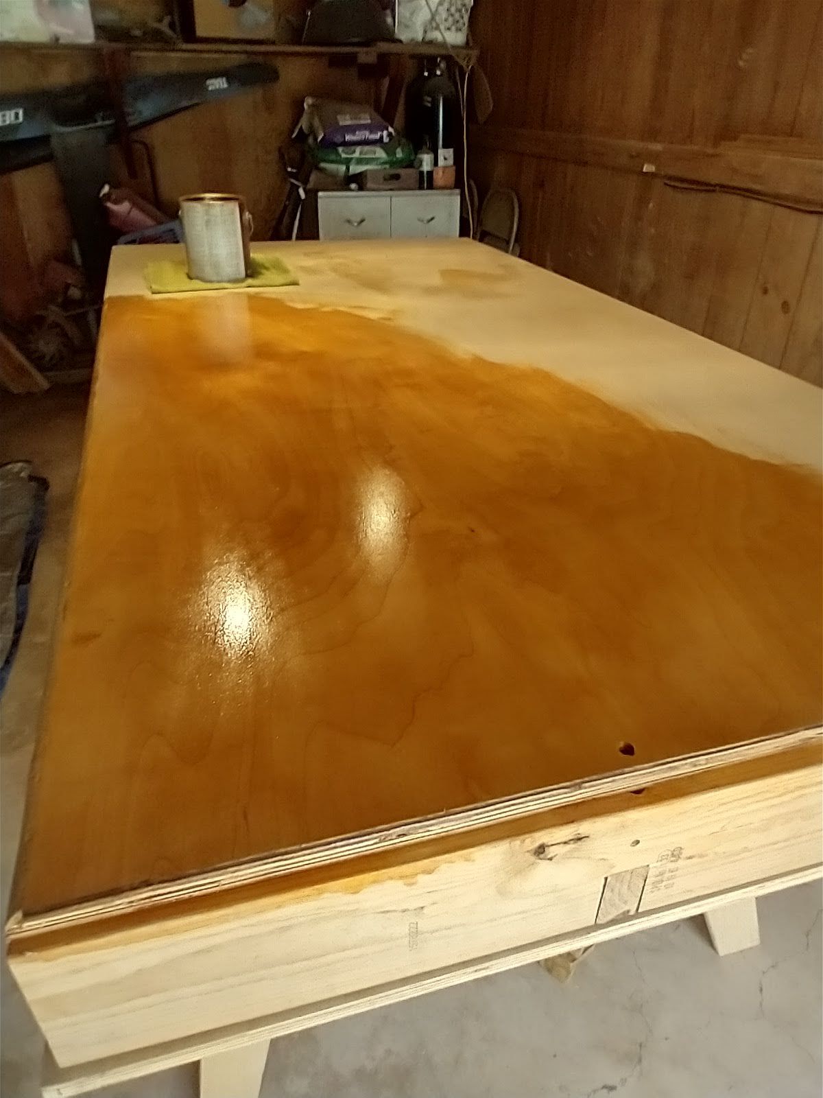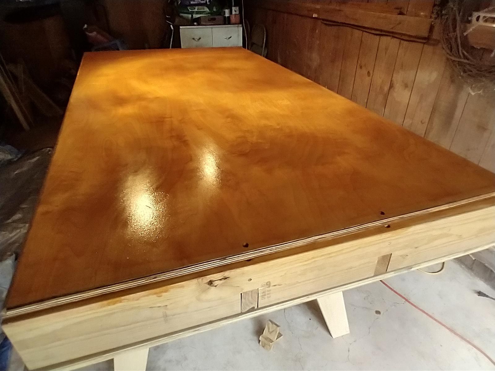 Here's the frame on the lower part of the table. I'm using sawhorses for legs! The table surfaces are beautiful laminated oak (which was cheaper than plywood due to the super high construction costs right now!).