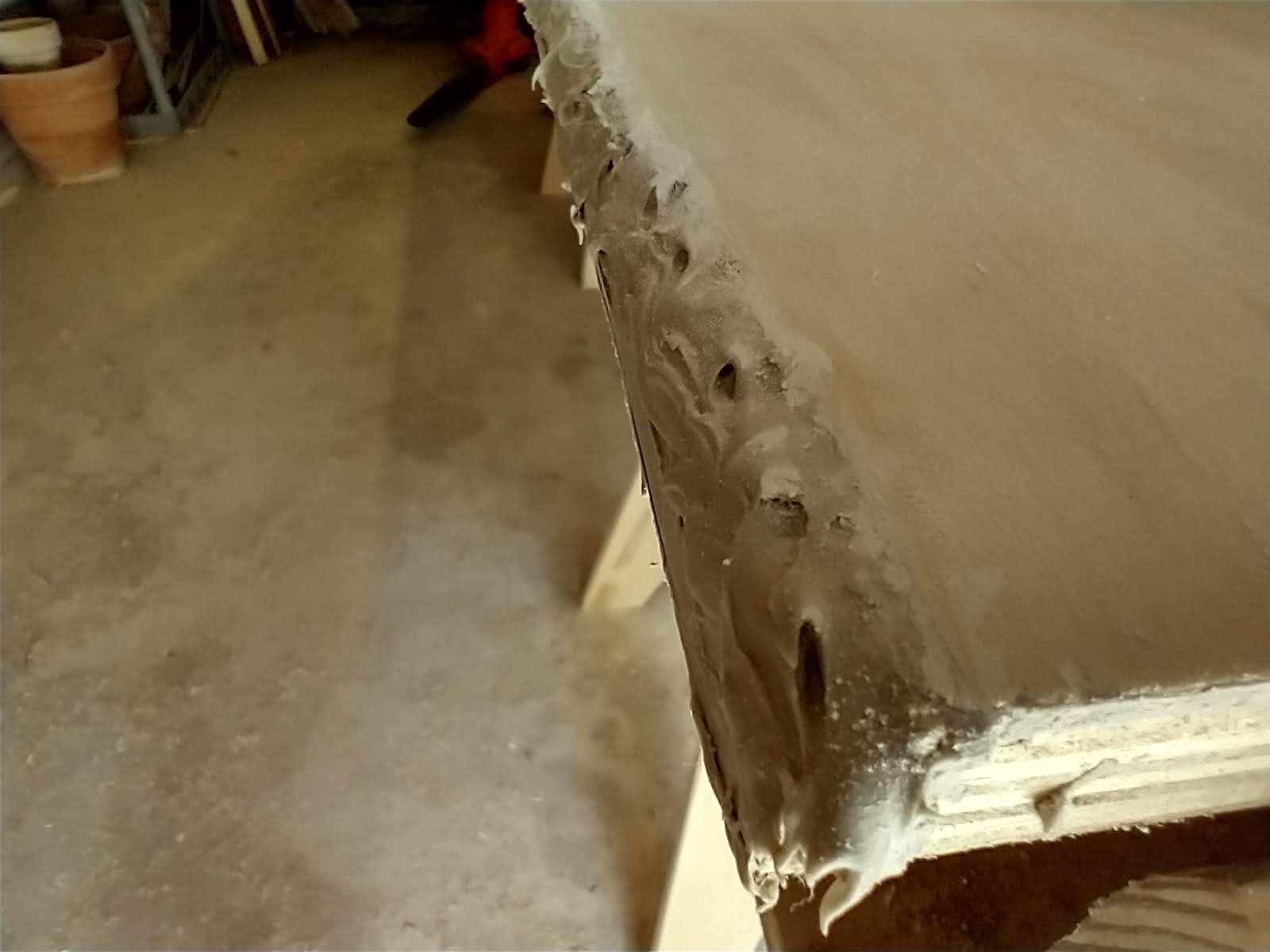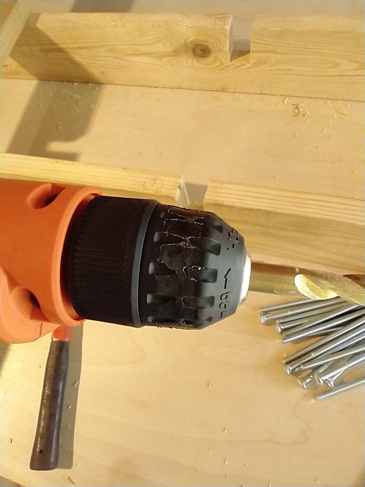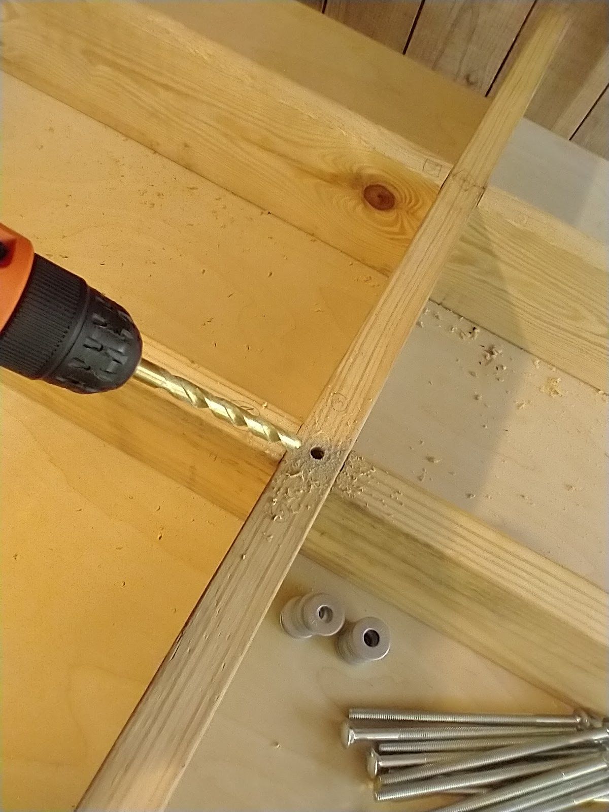 The next step was to drill holes for the bolts that hold the whole table together! As you can see from my pictures, my drill could make it through the top board, but not the lower one. My drill was too fat and I melted some of the plastic from letting it rub against the wood: