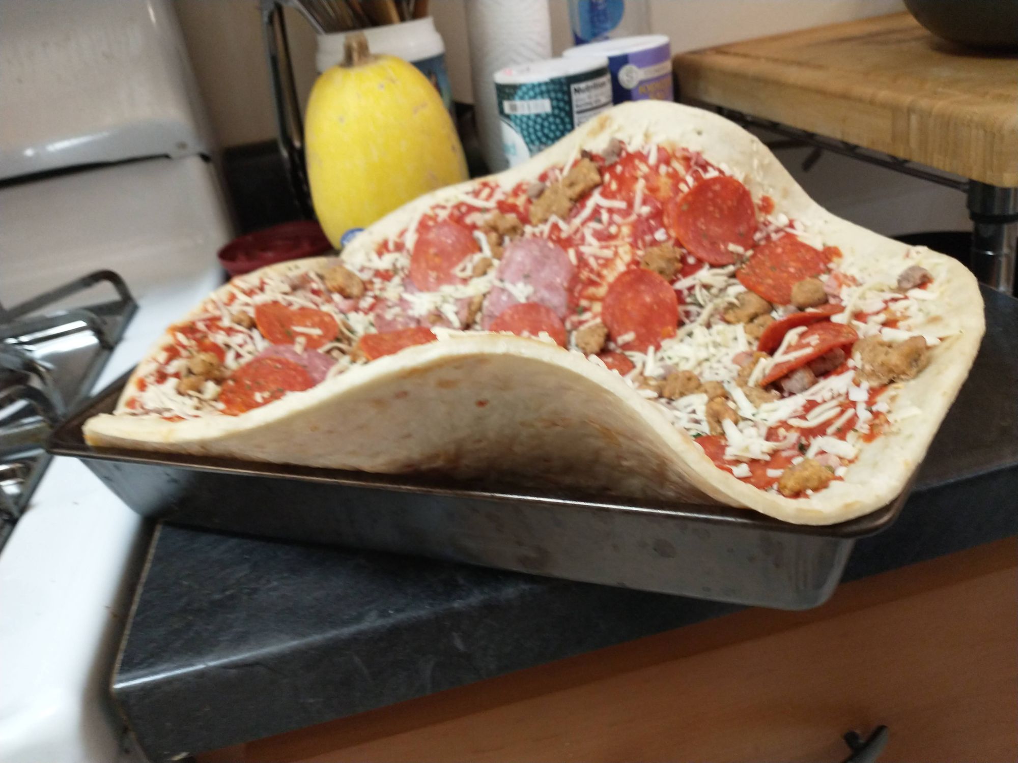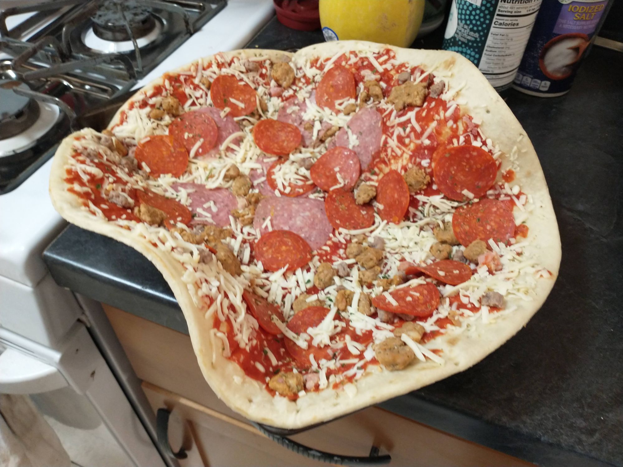 We don't have a pan big enough to hold it, so we put it in the biggest pan we have. While we cooked it, the edges flopped down and spilled cheese, meat, and tomato sauce on the bottom of the oven. All the stuff that spilled caught on fire and made a lot of smoke.