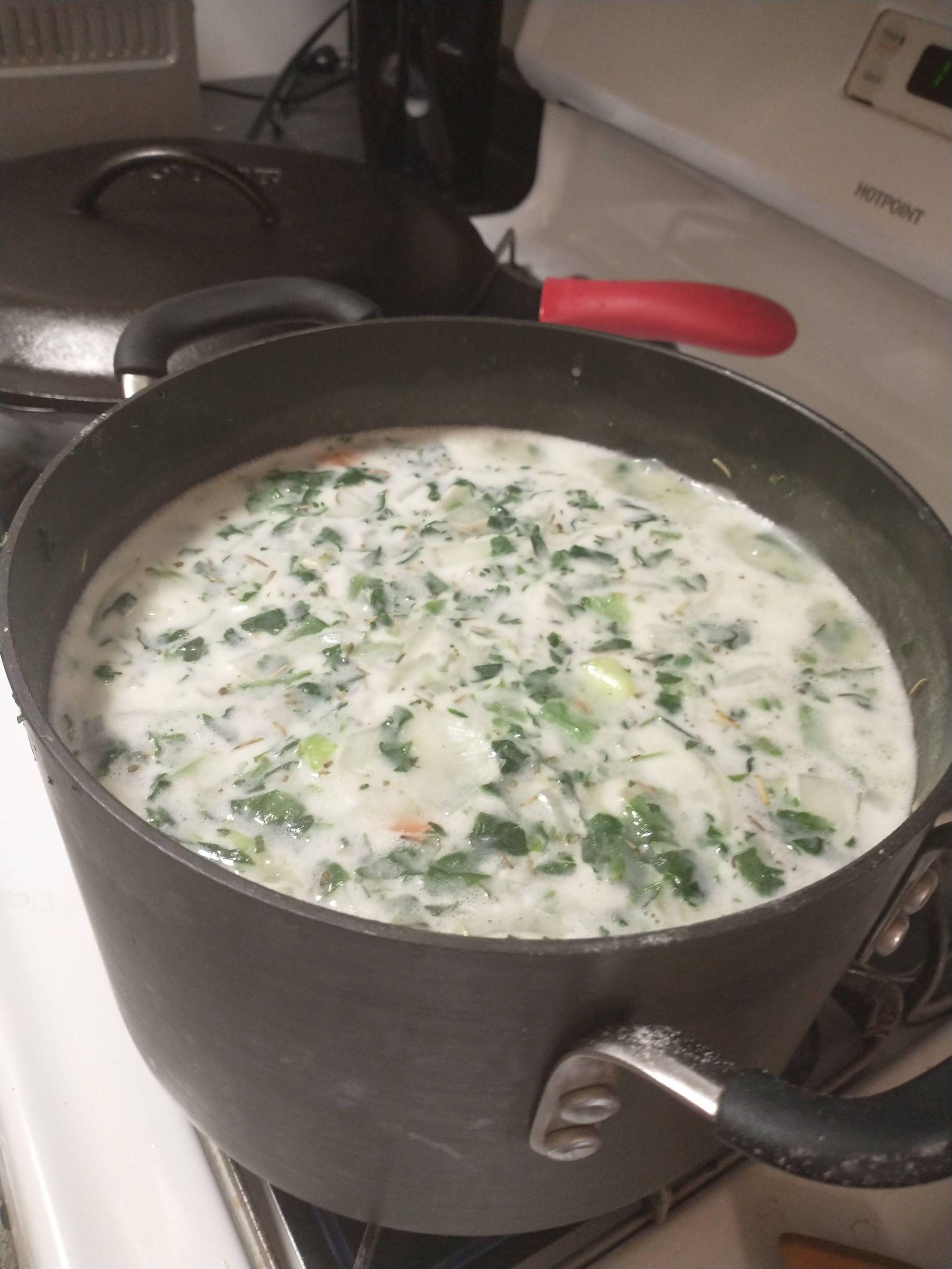 Once you've chopped the veggies and potatoes, you mix them with a roux and soup juices (like broth and milk). Boil it until it's the consistency of pot-pie filling.