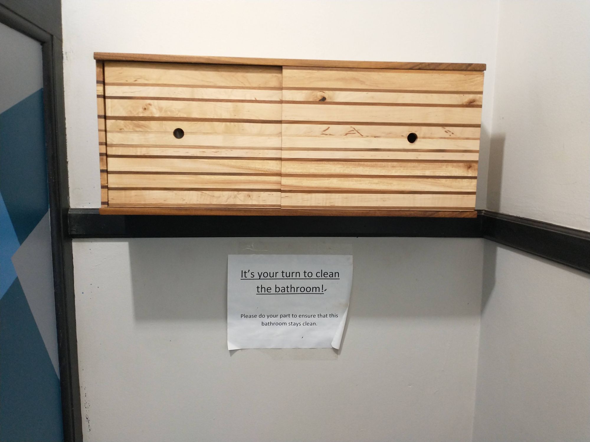 This is one of the only places in the world where you have a handmade bathroom cabinet made by a skilled carpenter hanging above a sign requesting that you clean the bathroom yourself!