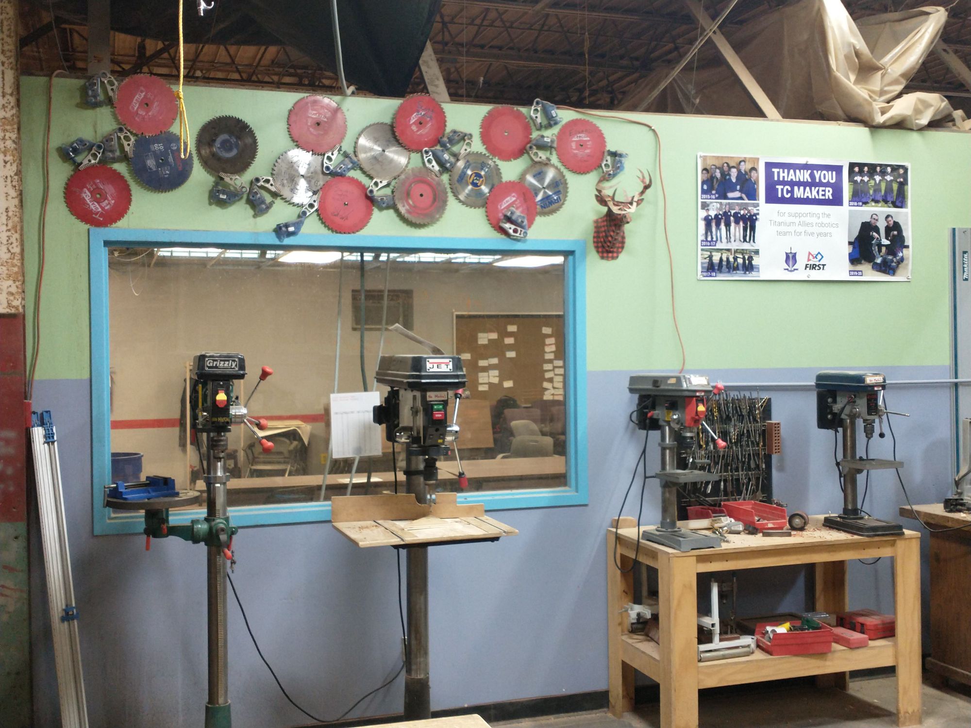 Take a good look at those sawblades on the wall just above the window to the fully equipped, multimedia classroom/kitchen space. Those blades are all caught in the Sawstop-brand safety mechanism. That's right! This makerspace has a state-of-the-art table saw that stops the saw blade after it senses your finger, but before your finger gets chopped off. This will really help me sleep at night.