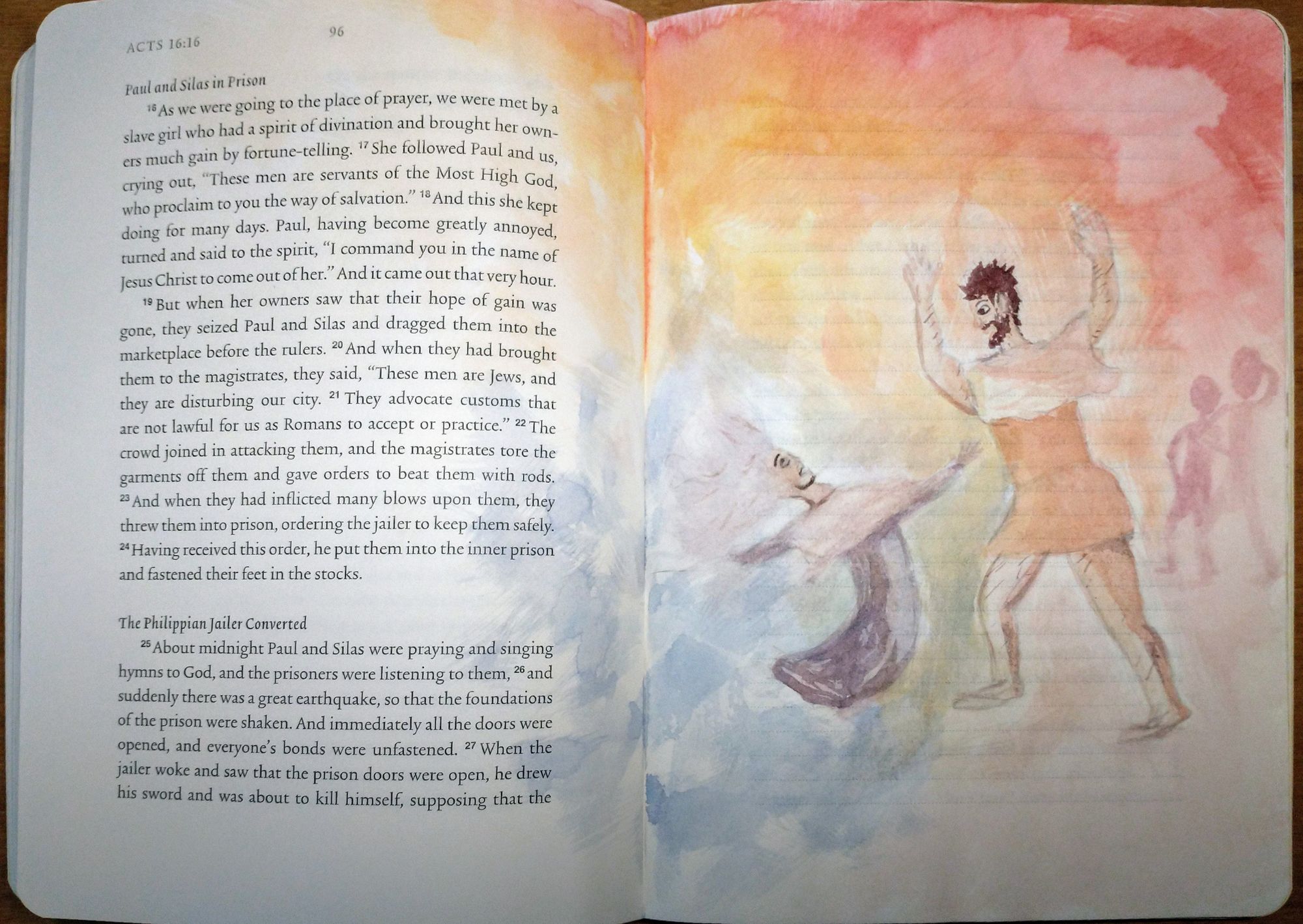 This is Paul casting out a demon. I'm not sure if this is exactly how it looked, but this is what came to mind when I tried to imagine it. I'd like to think that this shows the spiritual reality behind the black text on the page. Try to put yourself in the shoes of one of the onlookers in the background!