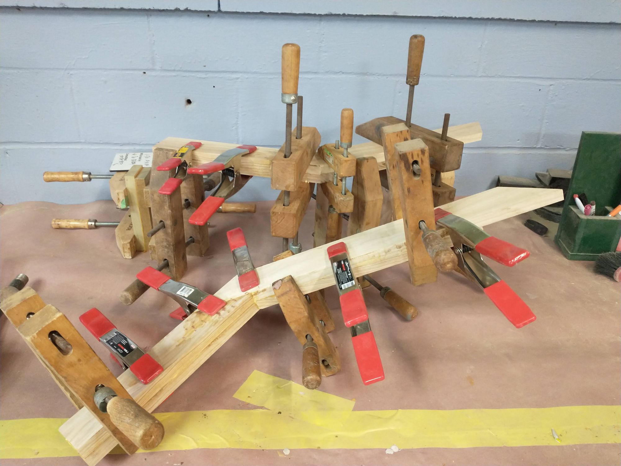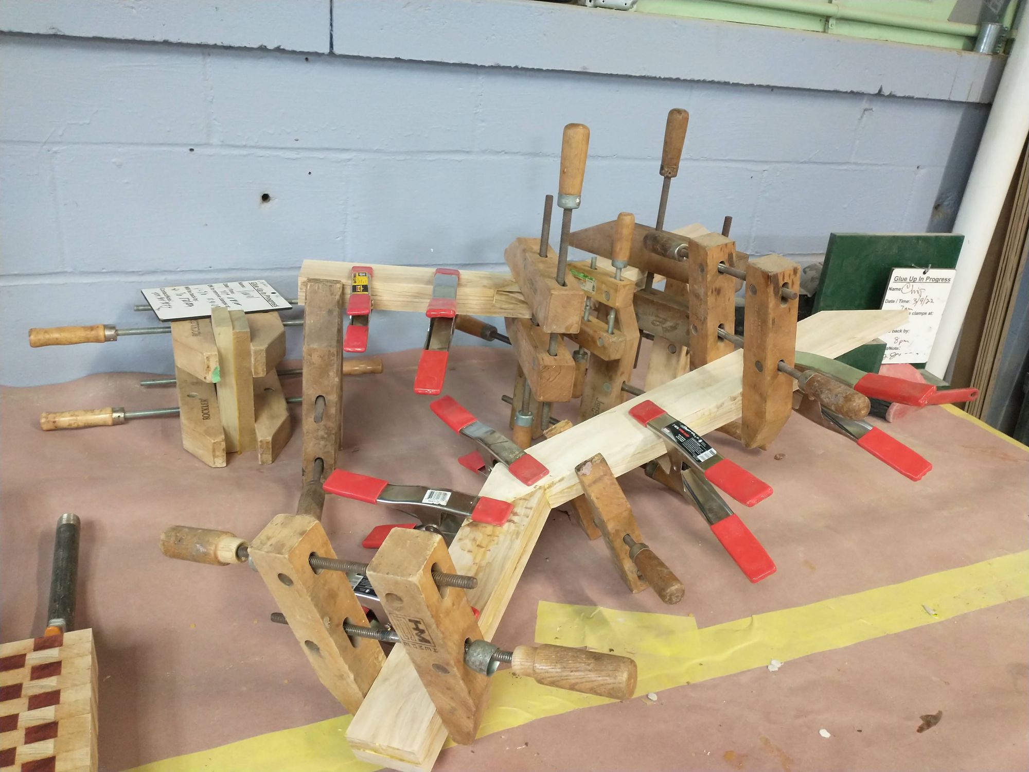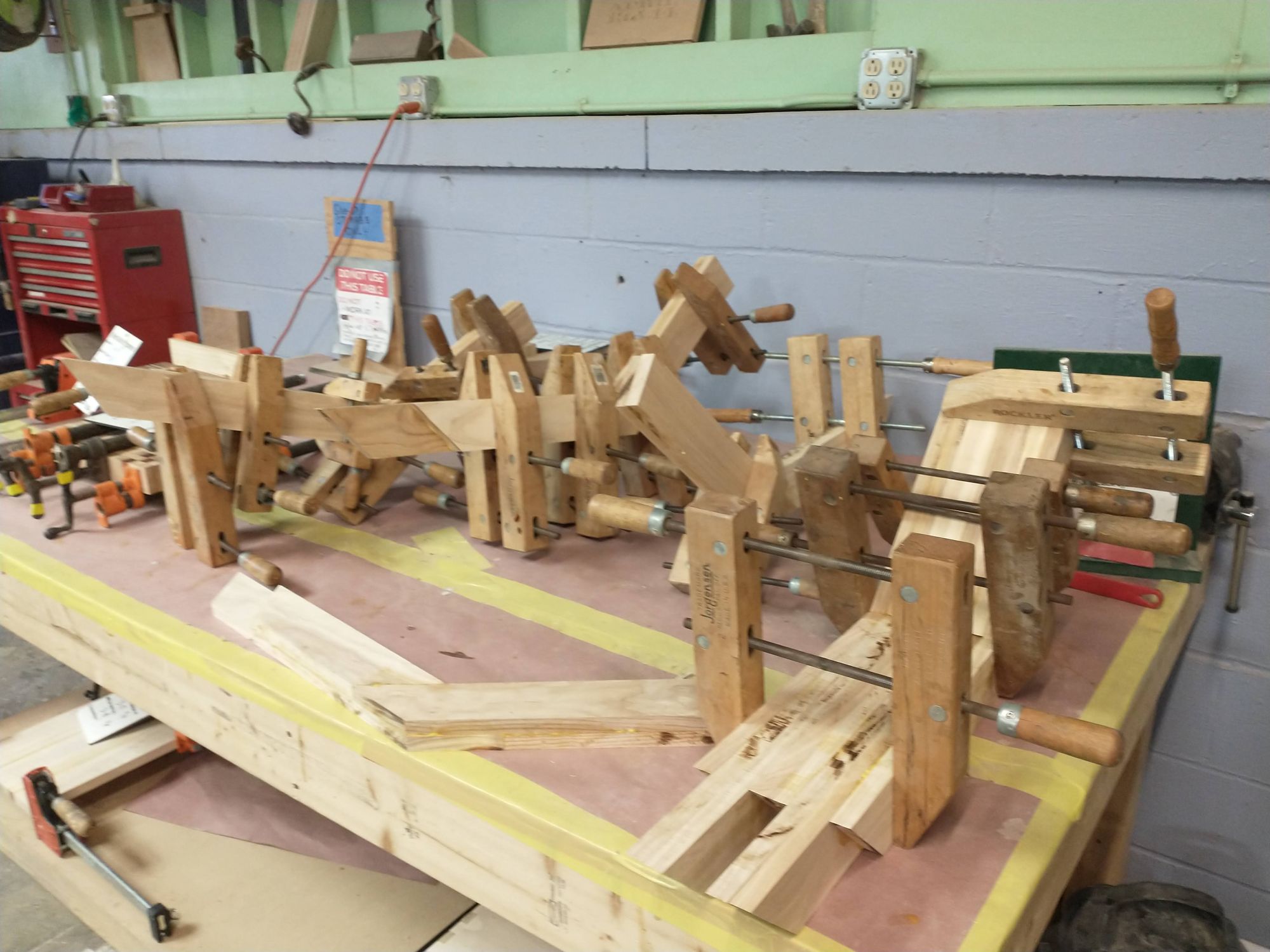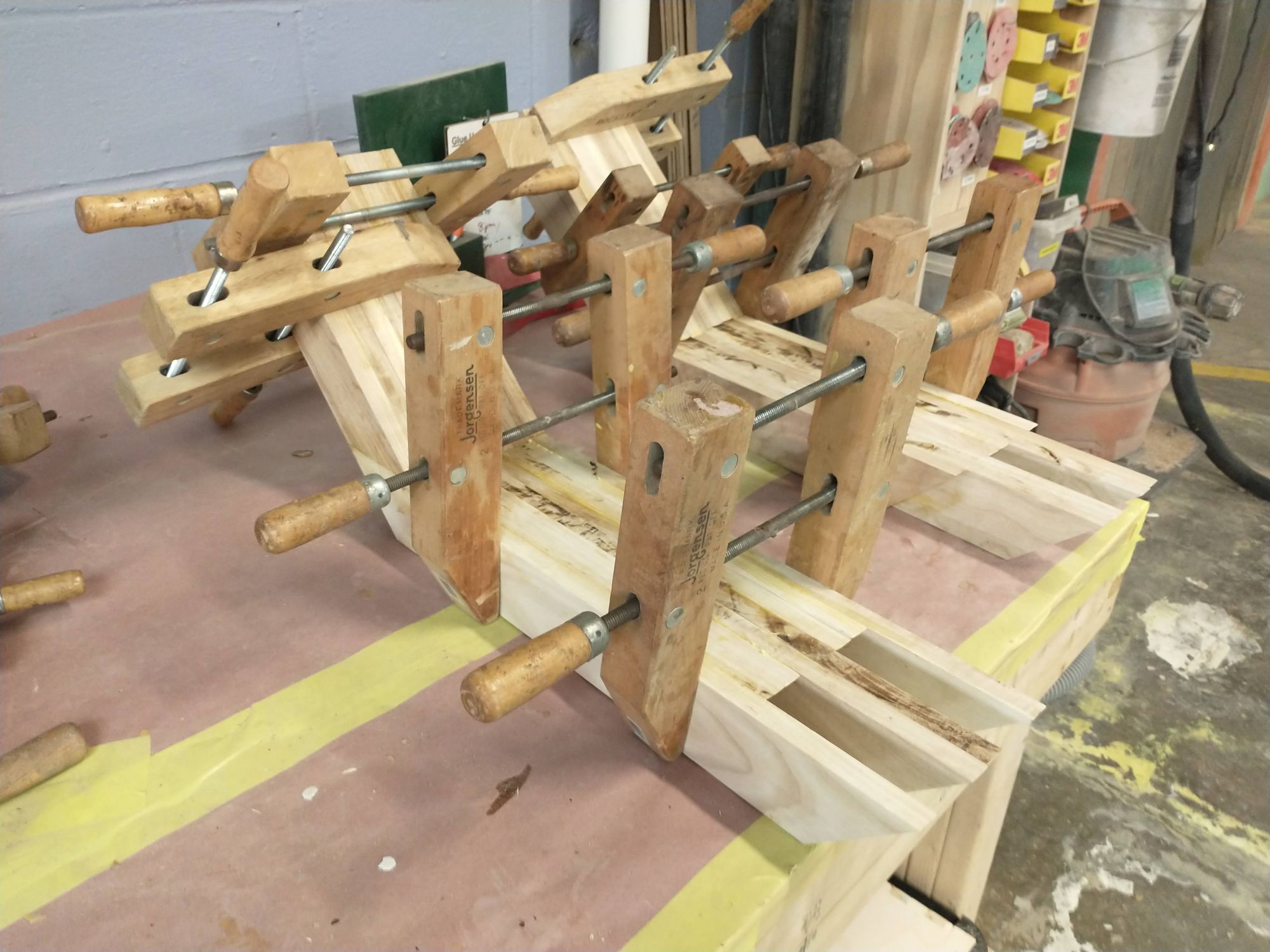 But in the meantime, take a moment to appreciate how many clamps it took to get these legs perfectly sandwiched together. Note especially that clamping these was a process in space and time. I had to put the clamps on in a specific order to make sure everything worked right.