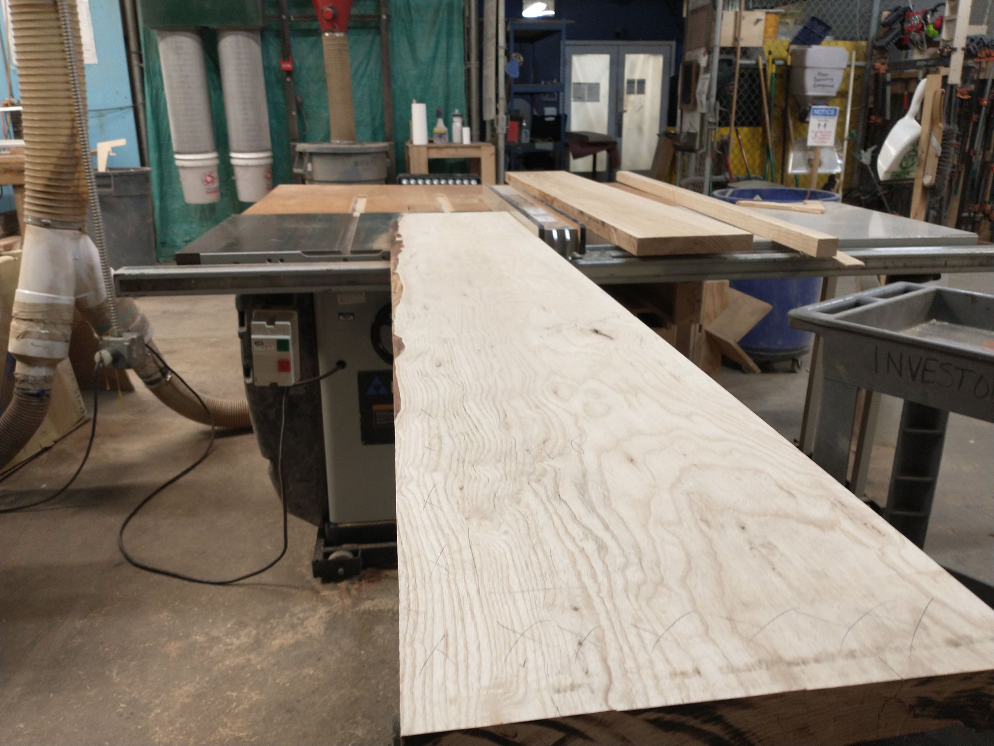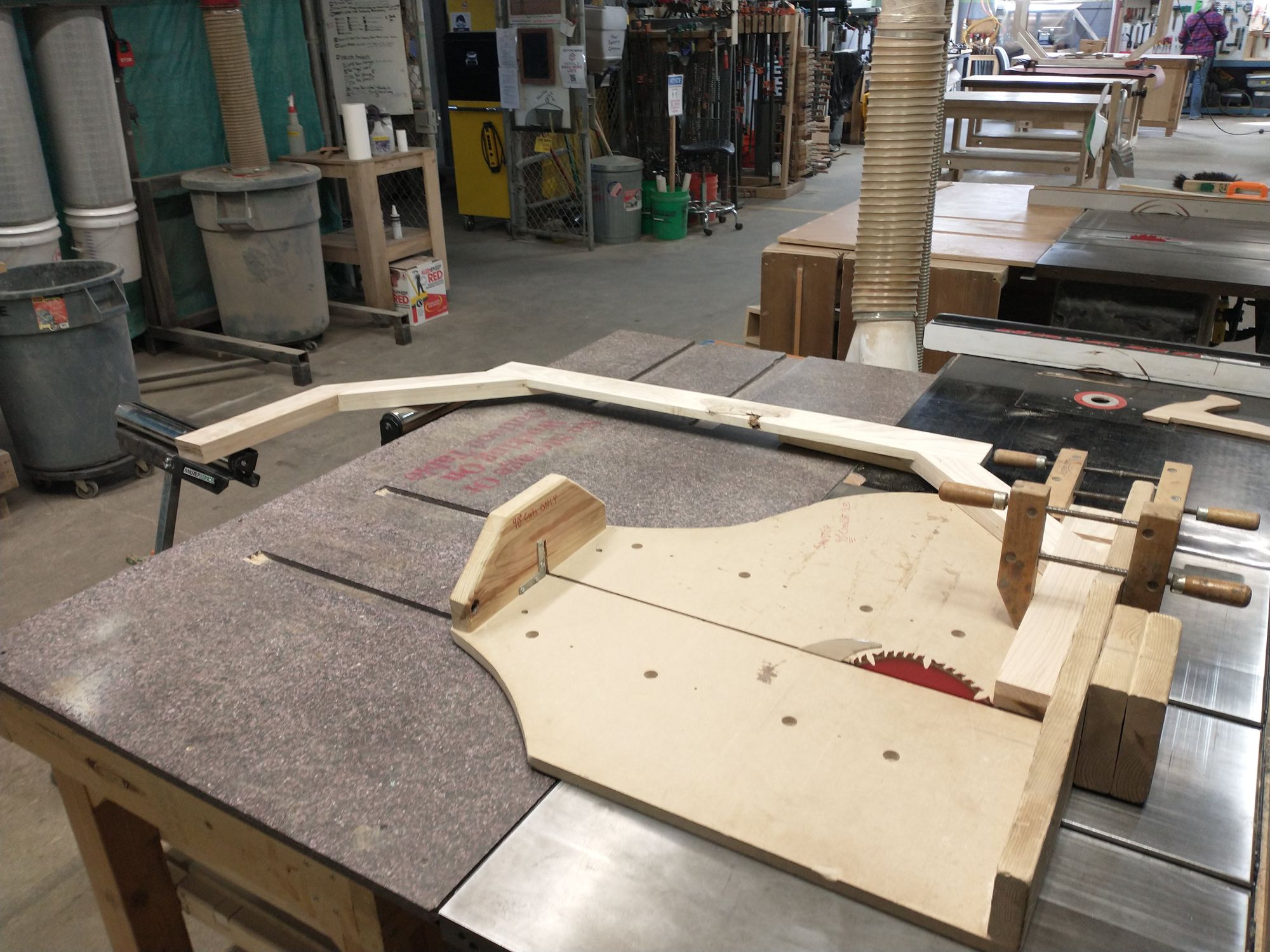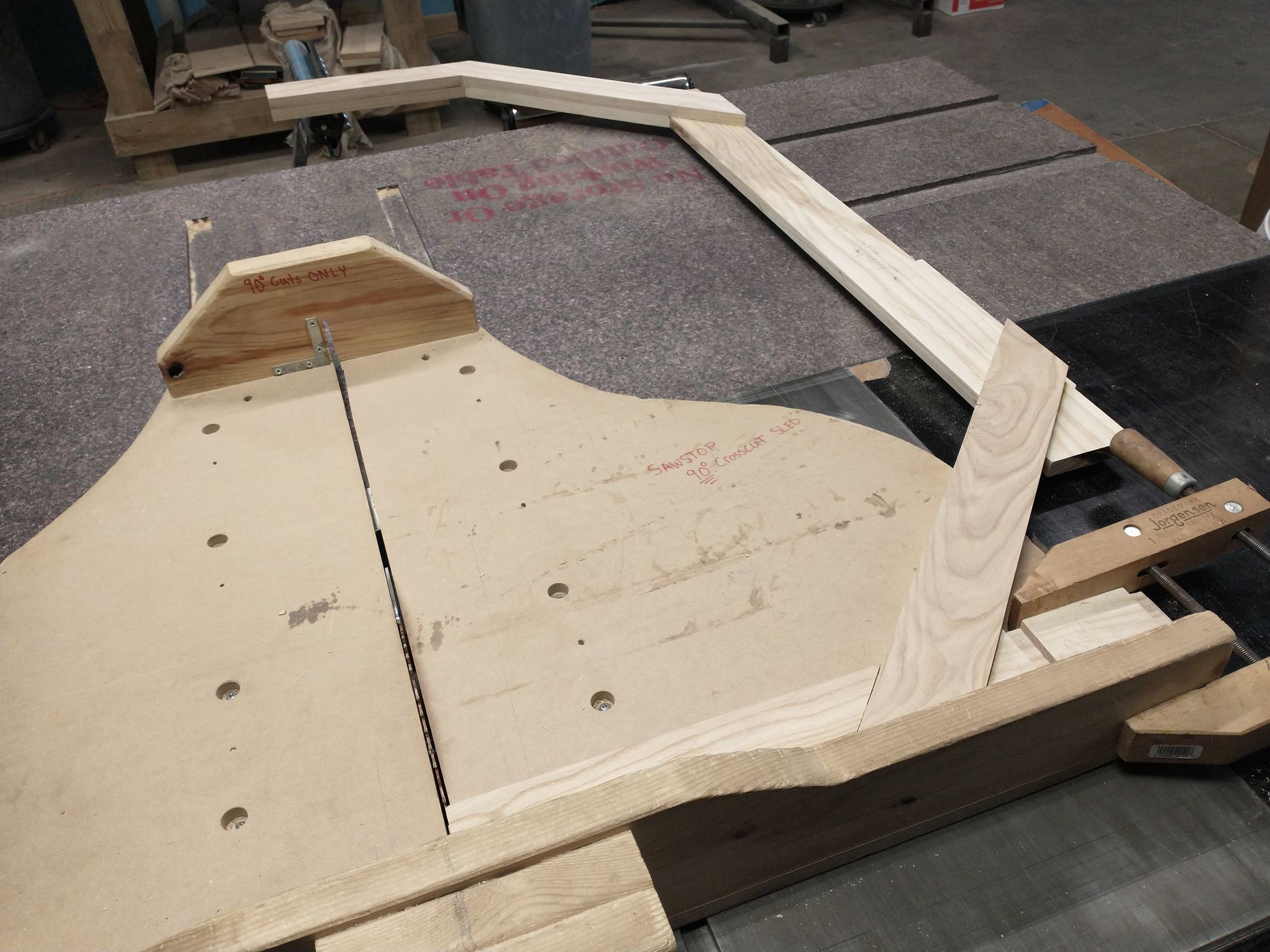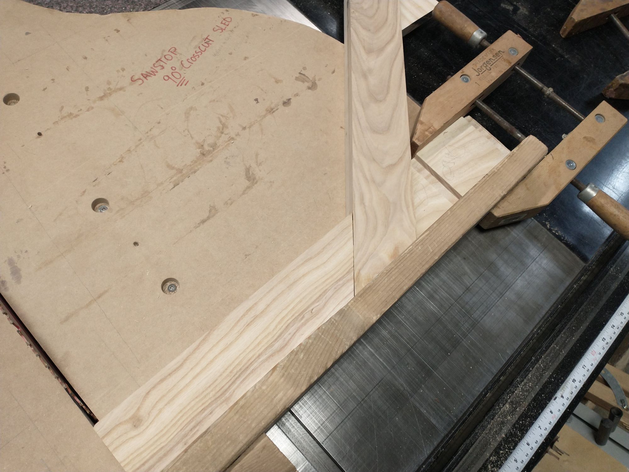 Fortunately, I'm an engineer and had planned for this! I didn't cut the legs to their final length until after I glued them on. That gave me plenty of wiggle room to make adjustments, but I later discovered that the table saw isn't quite spacious enough to fit my whole assembly: