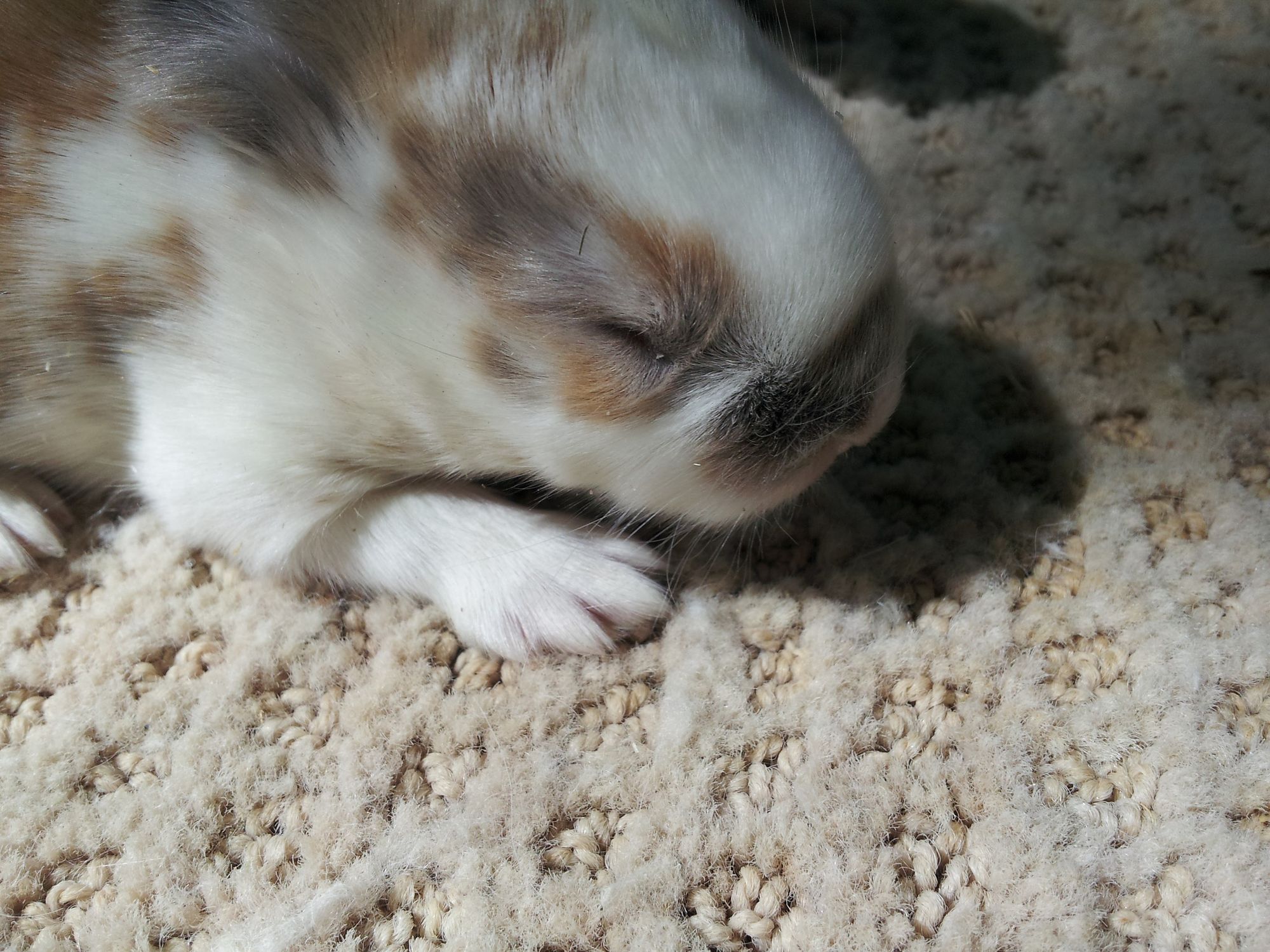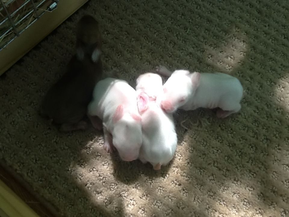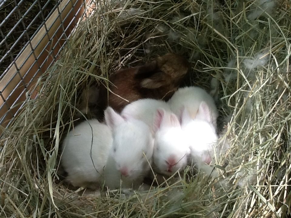 Here's another littler of babies! These came from Poison Ivy, my least favorite rabbit of all time. Notice how they have splotches of color (not like Obi-Wan's nice bands of color)? Well, that's a disqualification for rabbit shows, so these babies along with their mother were quickly removed from my breeding program: