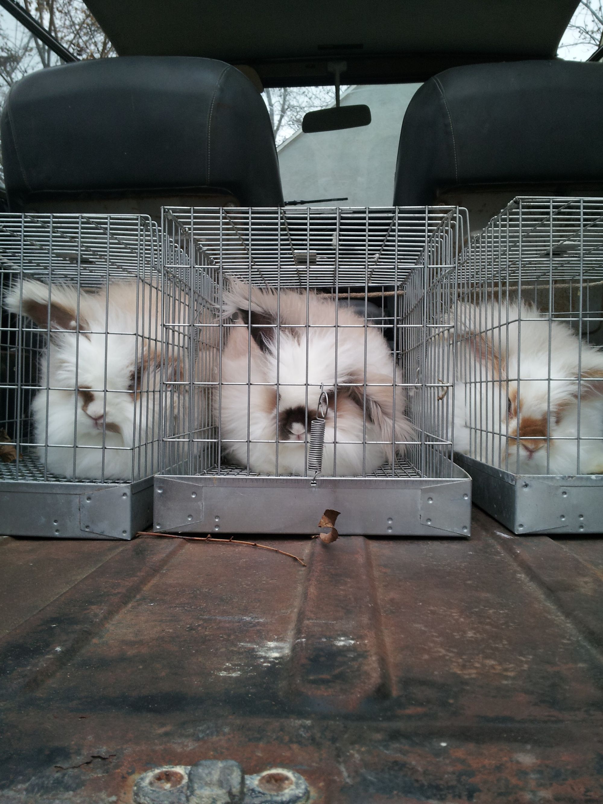 And here they are on the way to the local show! (They made an exception for my multicolored rabbits that year):