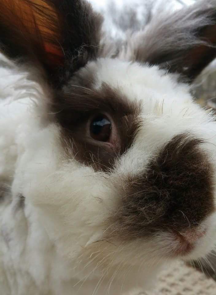 Rabbits come in all different colors. Here's Obi-Wan Kenobi, one of my personal favorite rabbits of all time. When you blow on their wool, you can see rings of color throughout his coat: