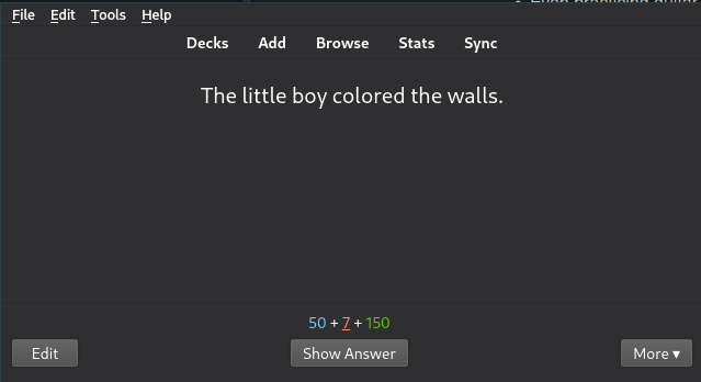 This is my prompt. The blue number at the bottom shows me how many new cards I'm due to learn today (I've limited it to 50 per day now that I'm no longer in language school). The green number shows me how many cards I'm due to review today (again, I've limited it to 150). The orange number shows me how many cards I'm actively learning.