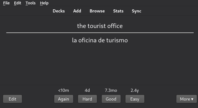Isn't that amazing! If the card's still difficult for me, I can review it again today (within 10 minutes!), but if it's super easy and I know it by heart, I don't have to see it again for 2.4 years. This is the power of Anki!