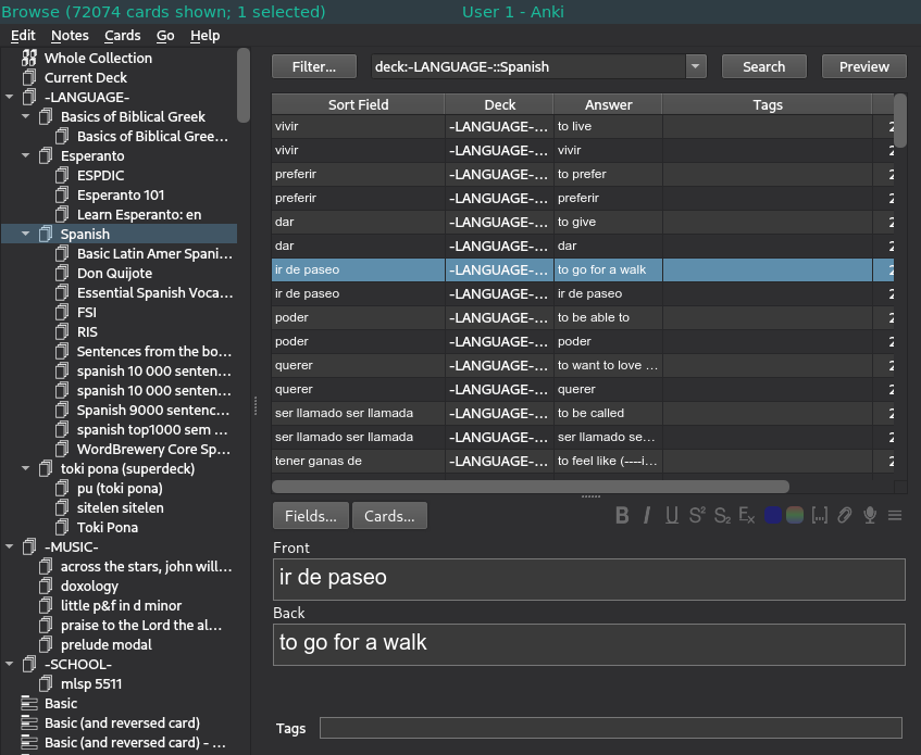 But in reality, that's way too many cards to carry around and way too many cards to review every day. Instead, I copy and paste the vocabulary assignment into a spreadsheet and import it directly into Anki. Here's a summary of all my Spanish flashcards (note, this is not what the app normally looks like! I'm just showing you all my cards in a list here):