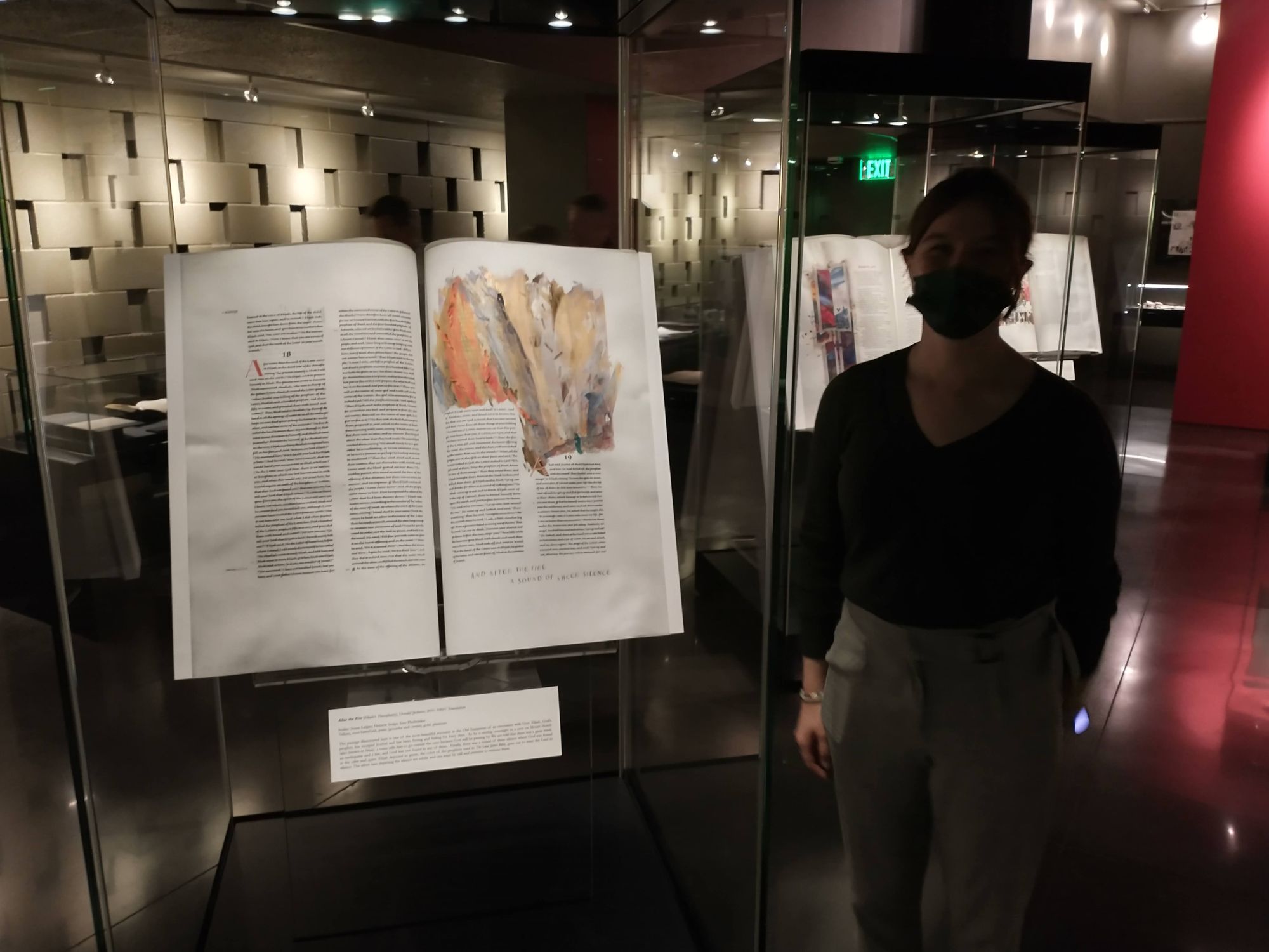 The first thing that struck me about the Bible was its scale. It's huge! Three feet by two feet when it's opened. But it's actually always opened at this point because of the next surprising thing: the St. John's Bible isn't bound! It's all loose 2'x3' sheets of vellum. Here's a picture of the docent standing next to some pages for scale: