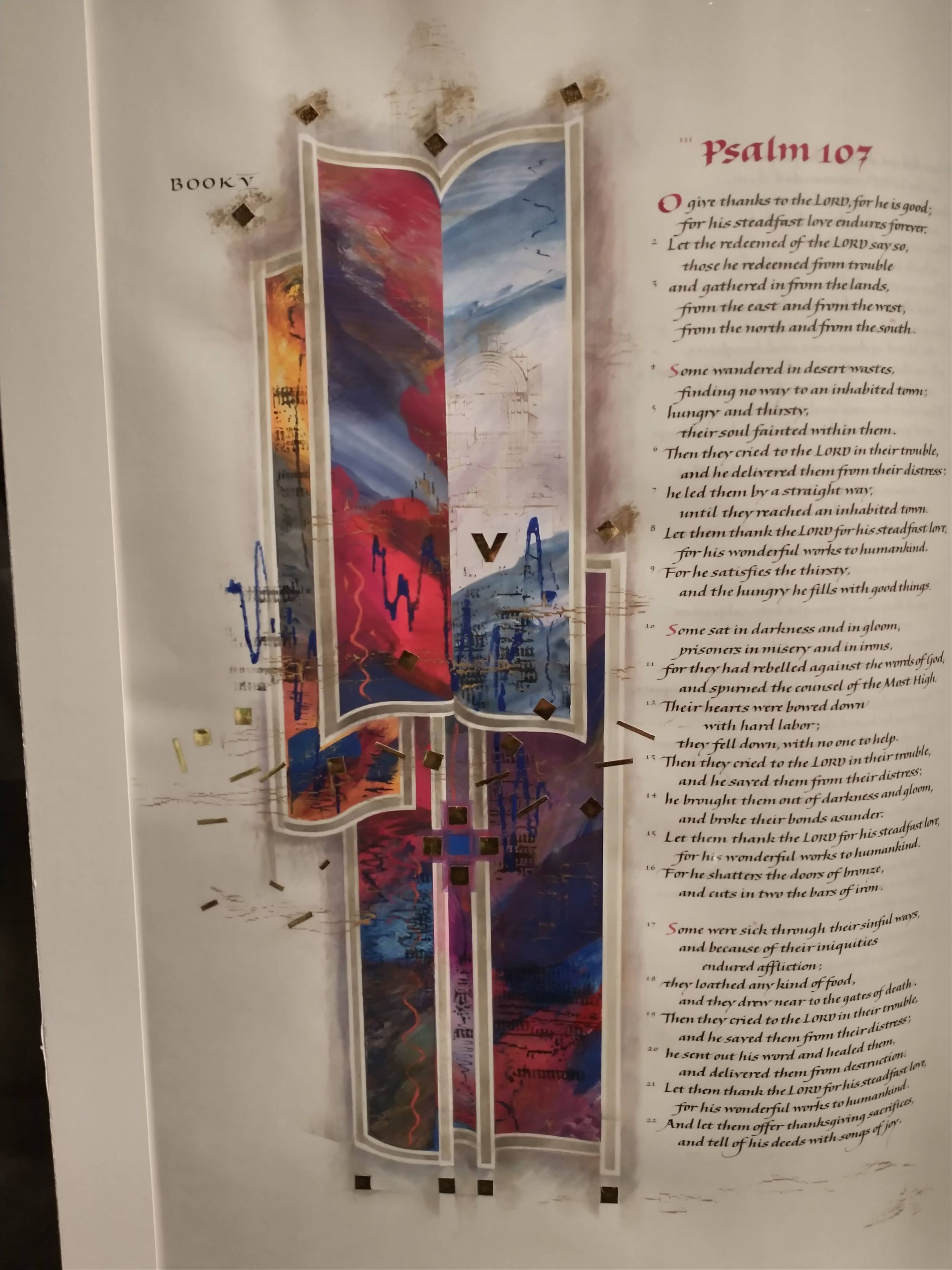 Wisdom of Solomon, Hazel Dolby: "The story of two women, each claiming to be the mother of one child, is probably the most famous account associated with Solomon. The episode exemplifies the depth of Solomon's wisdom, the one gift the king previously asked from the Lord. In this illumination, pain and darkness are reflected alongside the words of Solomon's wisdom. The gold division cuts through the darkness with the tip of the sword dividing the space in two. The textured, dark, brooding background reveals the complexity of the situation while Solomon's compassion glimmers with gold. His people held Solomon in awe, and the contrasting textures and colors demonstrate this."Psalms Book V Prontispiece, Donald Jackson: "Superimposed on this image are digital voice prints (electronic images of sound) of sung chants, hinting at the way we might 'see' psalms if they are sung or read poetically. The voice prints come from recordings of the monks at Saint John's Abbey singing Gregorian chant; a Native American sacred song; a Jewish men's chorus singing psalms; Bhuddist tantric harmonics; an Islamic call to prayer (adhan); Taoist temple music; Hindu bhajam; and an Indian Sufi chant. The voice prints of the Saint John's monks appear on every page, moving horizontally throughout the Psalms in gold. The voice prints of other traditions run vertically throughout the pages with the scroll designs."Demands of Social Justice, Suzanne Moore: "Amos' prophecy urges his people to repent of their sins of social injustice caring for the poor and the downtrodden. Their failure to do so, according to Amos, will be their own undoing, which comes to pass with the Assyrian invasion of the Northern Kingdom in 722 BCE. ...""... The admonition, 'Yet you did not return to me,' here highlighted in a special treatment, is repeated often in the text as God warns of the consequences of their choices, disobedience and corruption. Through Amos, God promises swift justice for the unrighteous, as well as redemption for the poor and oppressed. The illumination is fractured into seven unruly pieces punctuated by the repeated text. The green, blue, and black panels, representing sky, sea and earth, are chaotic and not fruitful...""... The depiction ends with an abstract locust in the right margin, the curse of farmers from antiquity to the present. Social justice is a main theme in Amos, and the fractured words also refer to the ways injustice and inequality fracture society. God is a God of compassion; people have a choice, and yet they turn from God and do not put in place a society that welcomes."
