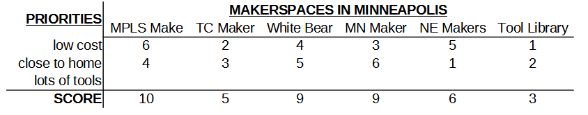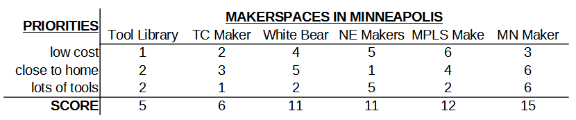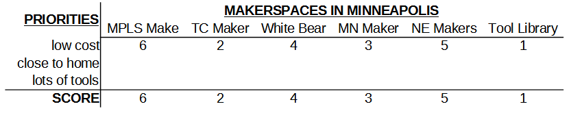 Using this scoring method, I found the makerspaces most likely to have the best balance of low cost, distance to home, and number of tools. Because the Minnesota Tool Library and Twin Cities Maker have such close scores, I will likely tour them both before deciding on one solution.